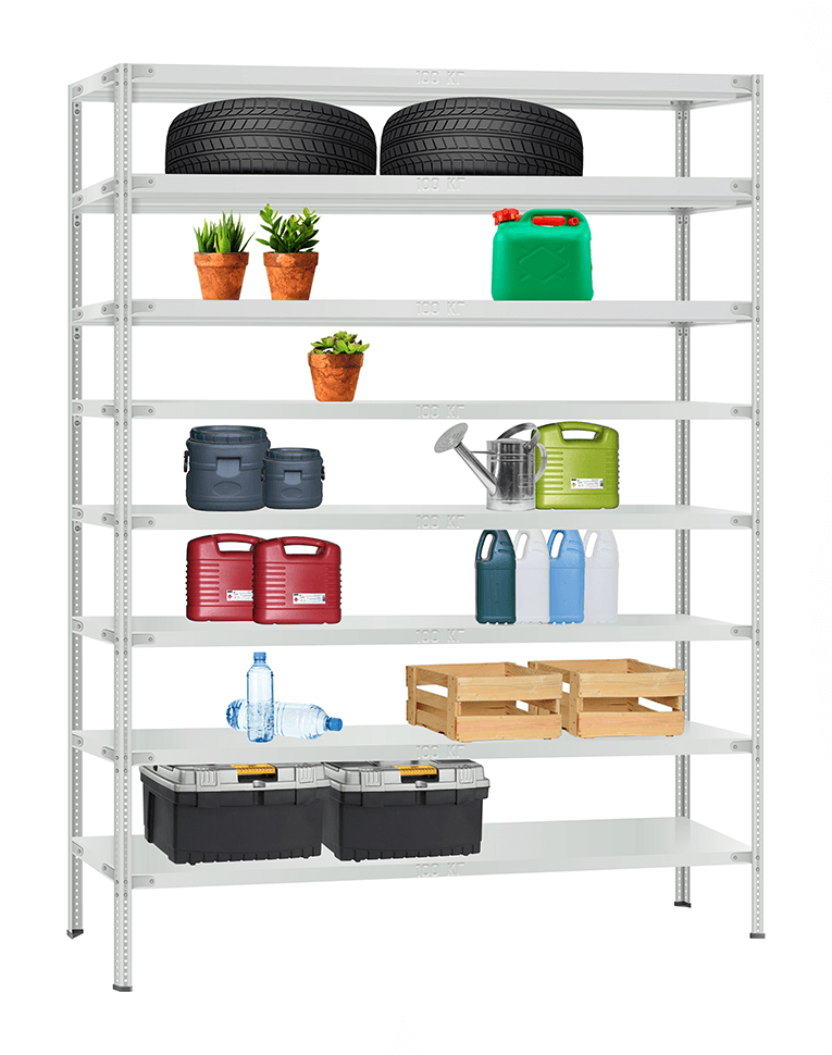 Универсальные усиленные стеллажи. Главная особенность серии - все полки усилены уголками жесткости.